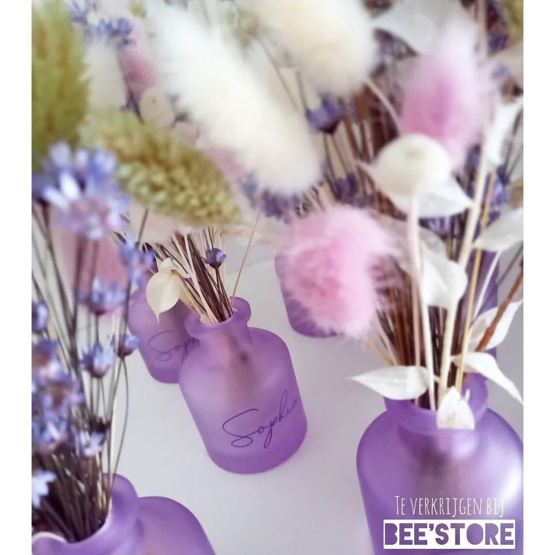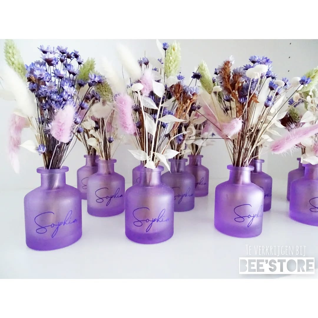 Gepersonaliseerd paars vaasje inclusief droogbloemenboeket (paars - groen - wit)