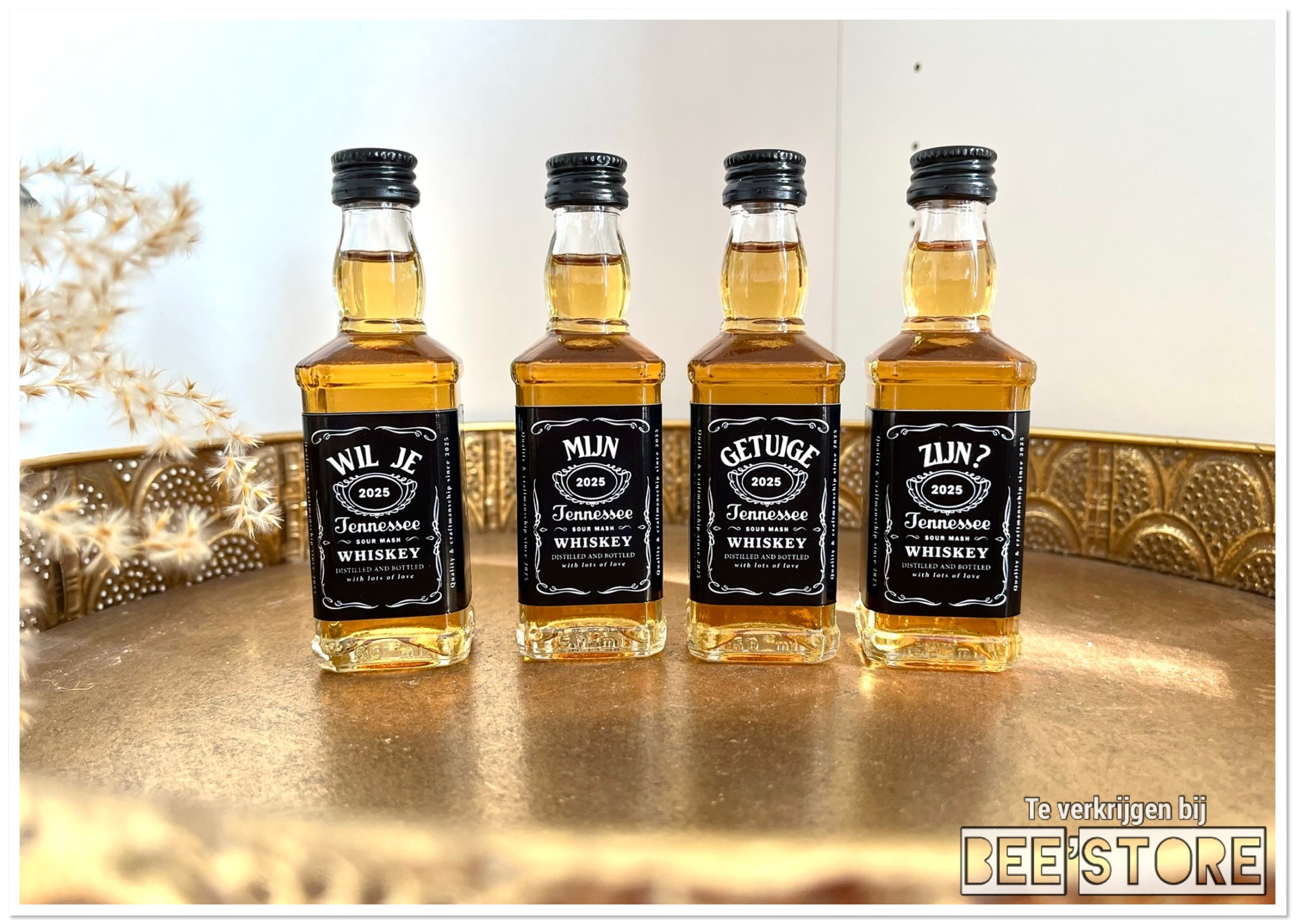Mini flesje Jack Daniels met een belangrijke vraag: 'Wil je mijn getuige zijn?'
